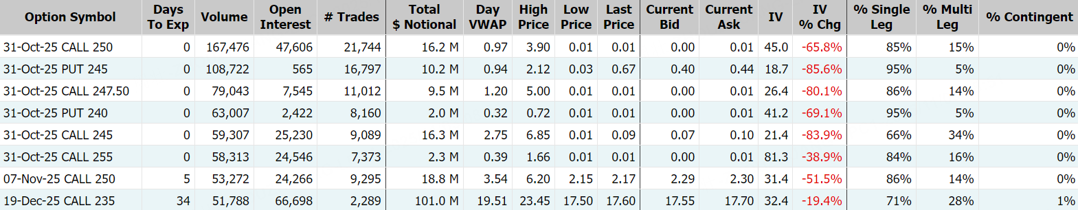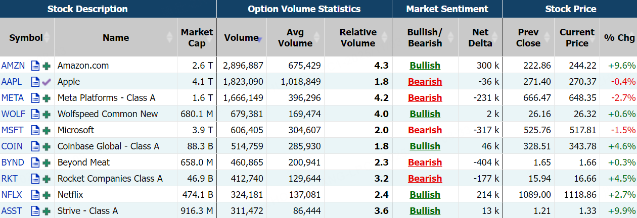 期权方面,亚马逊当日期权成交超295.98万张,较90日均量放大逾4倍,看涨期权占比升至66.7%,其中于10月31日到期的250美元行使价的看涨期权成交居前,成交近16.75万张。