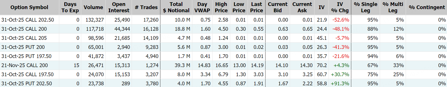 期权方面,Palantir当日期权成交超122.15万张,较90日均量放大1.5倍,看涨期权占比升至68.4%,其中于10月31日到期的202.5美元行使价的看涨期权成交居前,成交逾13.23万张。