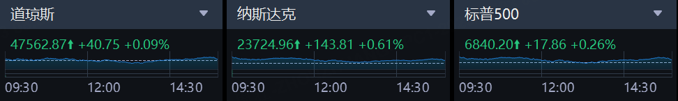 上周五,美股三大指数集体收升。截至收盘,道琼斯指数涨0.09%,报47562.87点;标普500指数涨0.26%,报6840.20点;纳斯达克综合指数涨0.61%,报23724.96点。