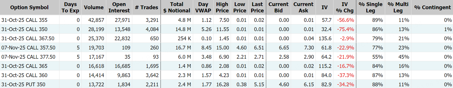期权方面,Coinbase当日期权成交超51万张,较90日均量放大近2倍,看涨期权占比升至70%,其中于10月31日到期的355美元行使价的看涨期权成交居前,成交近4.3万张。