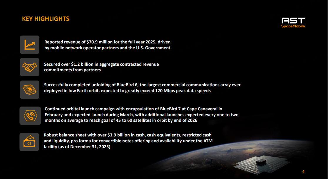 截至2025年底,公司持有的现金及流动性储备超过39亿美元,且已获得超过12亿美元的累计合同营收承诺,这为后续更大规模的商业化运作提供了坚实的资金安全垫。随着资本开支(Q4达4.067亿美元)和运营支出的增加,公司正全力推进Block2BlueBird卫星的量产,预计2026年在商业服务激活前,营收将伴随移动网络运营商及政府合同的持续推进而进一步增长。