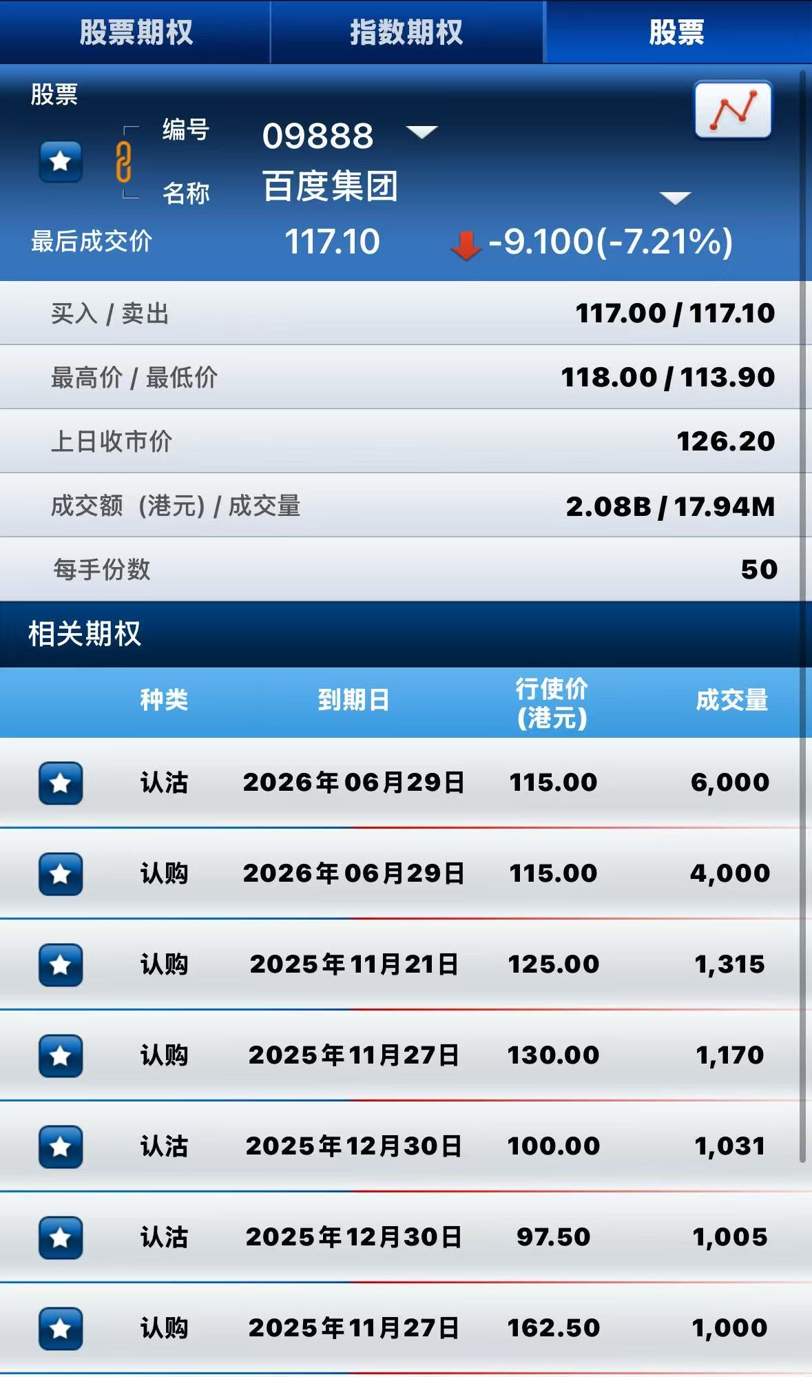百度集团-SW跌超7%,期权方面:半日成交超3.3万张合约,其中于2026年6月29日到期行权价115港元的认沽期权成交量居前,成交6000张合约。 $BIU.HK 20260629 115.00 PUT$