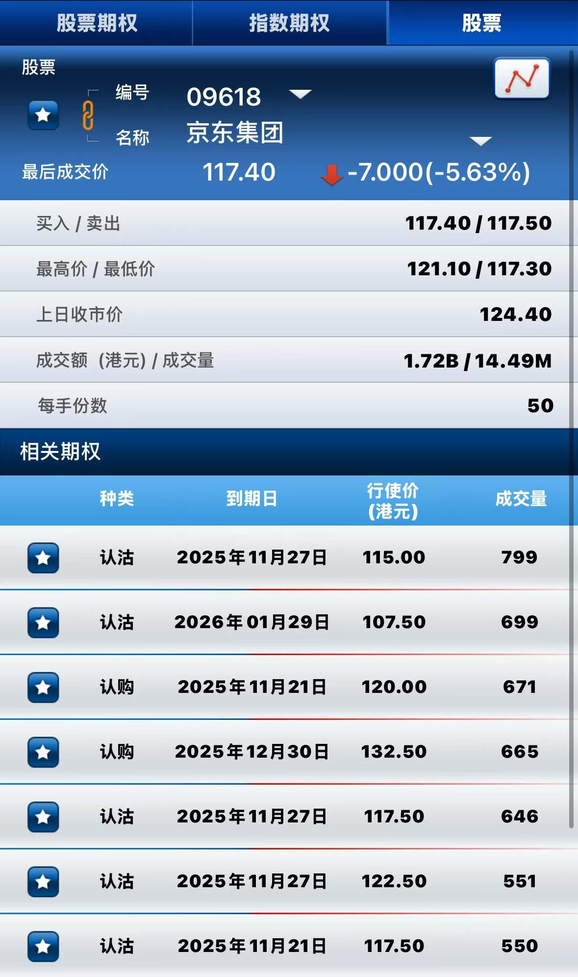 京东集团-SW跌超5%,期权方面:半日成交超1.9万张合约,其中于2025年11月27日到期行权价115港元的认沽期权成交量居前,成交近800张合约。 $JDC.HK 20251127 115.00 PUT$