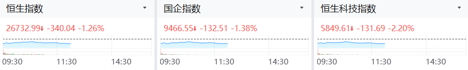 11月14日,港股三大指数齐跌,截止午间收盘,恒生指数跌1.26%,恒生科技指数跌2.20%,国企指数跌1.38%。