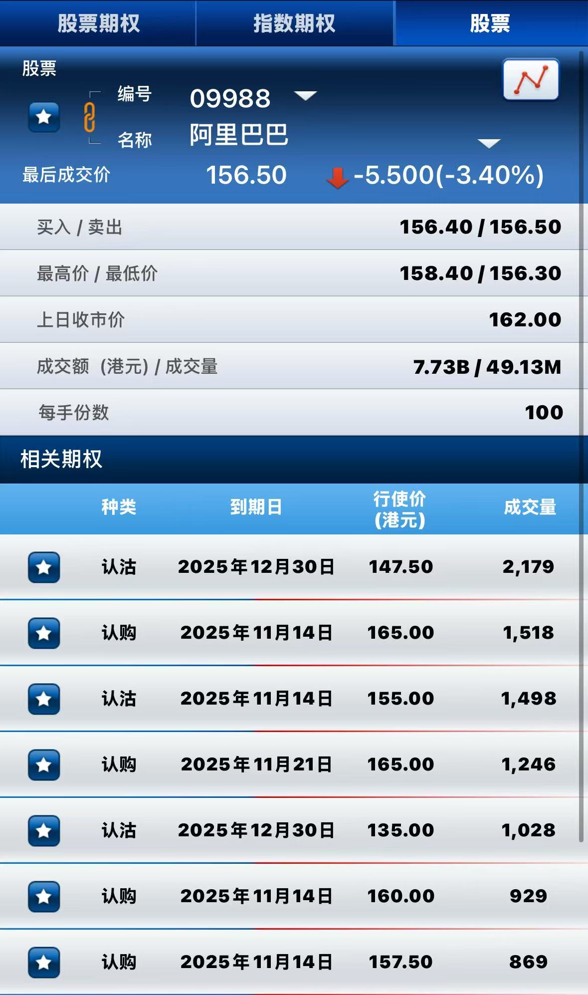 阿里巴巴-W跌超3%,期权方面:半日成交超3.7万张合约,其中于2025年12月30日到期行权价147.5港元的认沽期权成交量居前,成交超2100张合约。 $ALB.HK 20251230 147.50 PUT$