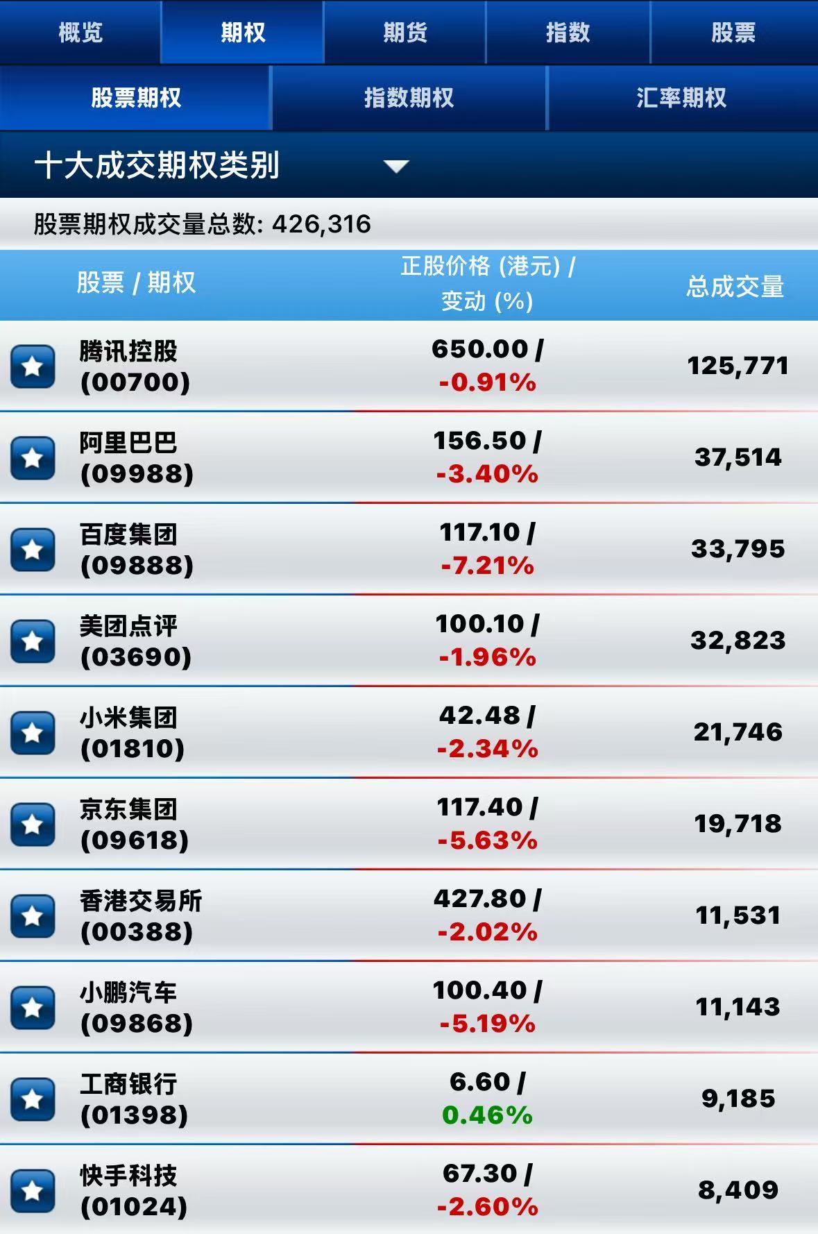 截止午间收盘,港股期权半日成交超42.6万张。其中,腾讯控股成交量居前,期权成交近12.58万张;阿里巴巴-W名列次席,期权成交超3.7万张;百度集团-SW位居第三,期权成交超3.3万张。