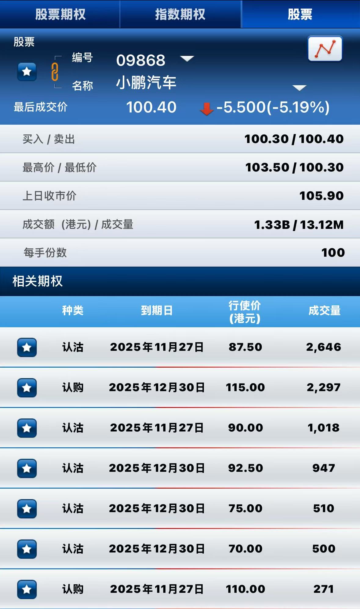 小鹏汽车-W跌超5%,期权方面:半日成交超1.1万张合约,其中于2025年11月27日到期行权价87.5港元的认沽期权成交量居前,成交超2600张合约。 $PEN.HK 20251127 87.50 PUT$