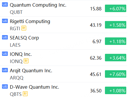 10月31日,量子计算概念股盘初震荡上行,Arqit Quantum Inc.涨超7%,Quantum Computing涨超6%,IONQ Inc.涨超3%,Rigetti Computing、D-Wave Quantum、SEALSQ Corp涨超1%。
