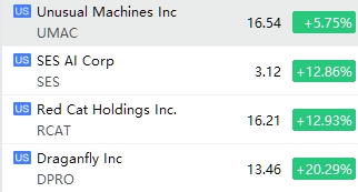 10月9日(周四)美股无人机股盘中表现亮眼,Draganfly涨超20%,Red Cat Holdings、SES AI Corp涨超12%;Unusual Machines涨超5%。
