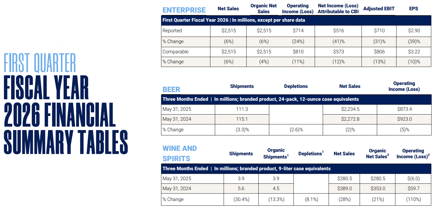 星座品牌2026财年第一财季净销售额下降6%(有机下降4%),营业利润下降24%(可比下降11%)。归属于星座品牌的净收入下降41%至5.161亿美元,报告每股收益为2.90美元,而去年同期为4.80美元。