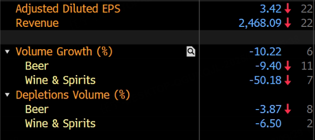 据彭博社数据,分析师普遍预期星座品牌第二财季调整后每股收益3.42美元,营收24.68亿美元,啤酒、烈酒业务均会出现同比下滑。