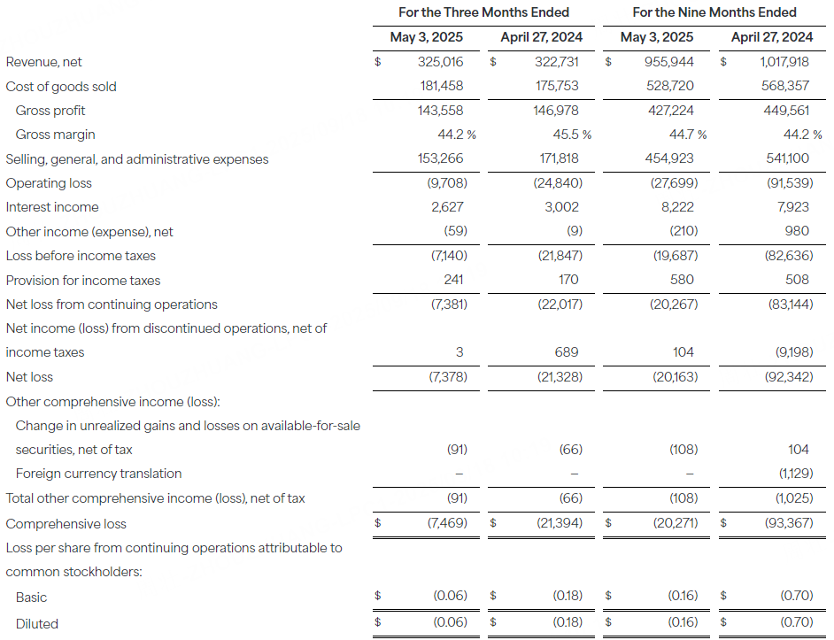 在 2025 财年第三季度,Stitch Fix 每股收益(EPS)为 -0.06 美元,成功超越市场预期的 -0.11 美元。公司收入达 3.25 亿美元,同样高于预期的 3.1513 亿美元。这一成绩的取得,得益于公司在运营效率提升以及产品创新方面的不懈努力。尽管活跃客户数量有所下降,但每客户收入的增加,彰显了公司在运营效率与产品多样化策略上的成效。例如,公司通过优化库存选择,为客户提供更符合潮流的风格,使得客户愿意为更优质的产品支付更高价格。