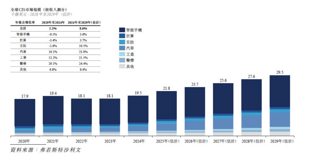 市场数据清晰地揭示了这一轨迹。据弗若斯特沙利文研究,全球CIS市场规模在2020至2024年间从179亿美元增长至195亿美元,年复合增长率(CAGR)为2.2%,处于稳步扩张期。而展望未来,在新技术催化与新兴应用爆发的驱动下,市场增长曲线将显著陡峭,预计到2029年规模将达到295亿美元,2024年至2029年的CAGR跃升至8.6%。这一增速的跃迁,标志着CIS产业正从传统的移动设备驱动,迈向一个由汽车智能化、机器视觉、AR/VR及工业自动化等多引擎共同驱动的新纪元。