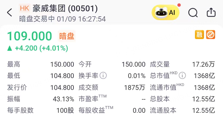1月9日周五, 豪威集团 开启暗盘,截至发稿涨幅超4%,不计手续费每手赚超400港元。豪威集团是全球领先的Fabless半导体设计公司,以CMOS图像传感器(CIS)为核心产品。