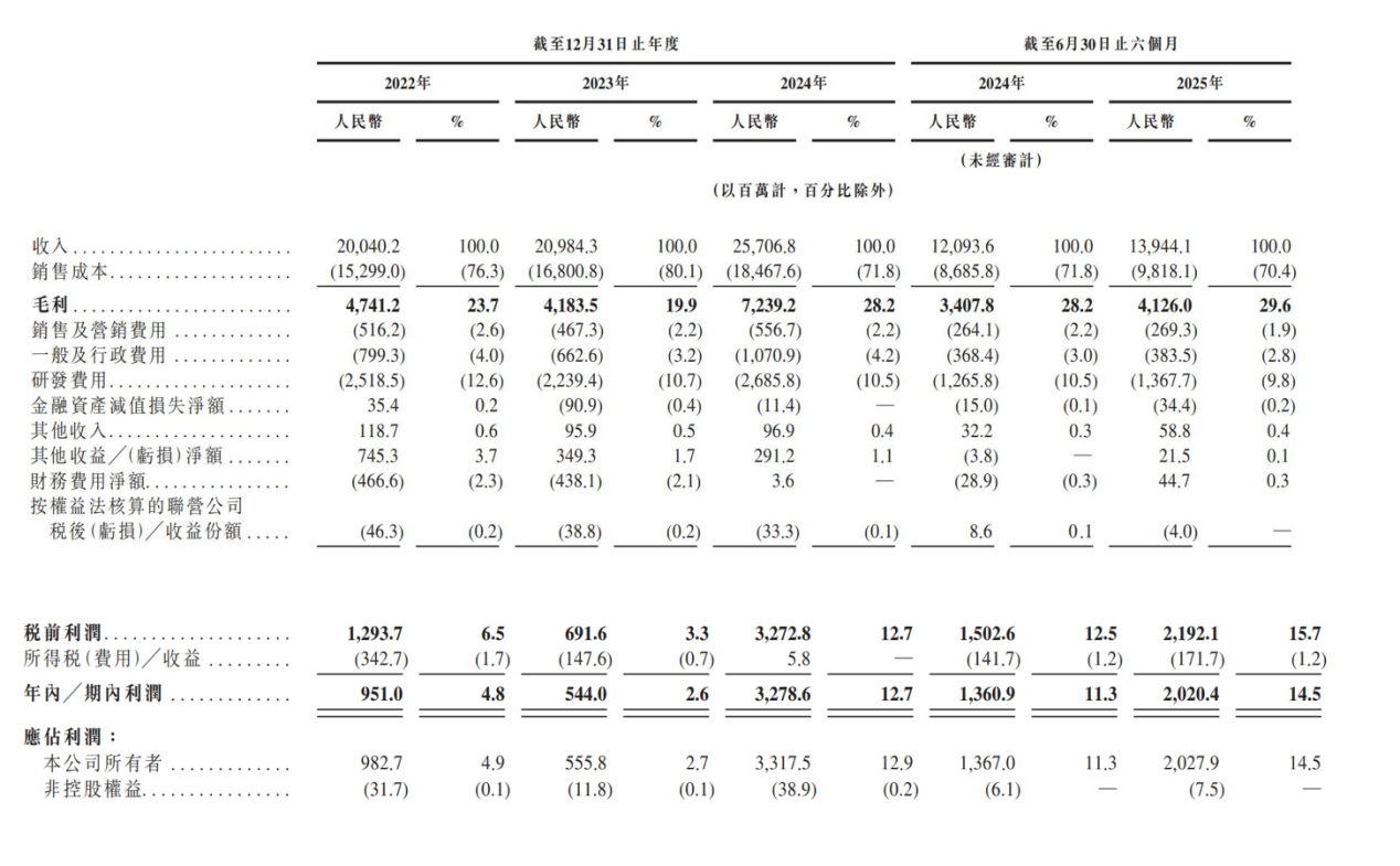 2022年度、2023年度、2024年度以及2025年1-6月(以下简称:报告期内),豪威集团实现收入分别约为200.4亿元(单位:人民币,下同)、209.84亿元、257.07亿元以及139.44亿元,2022-2024年复合年增长率(CAGR)约13.3%,2025上半年同比继续保持增长态势。同期年内利润分别为9.51亿元、5.44亿元、32.79亿元以及20.2亿元人民币,2024年利润同比激增502%。