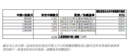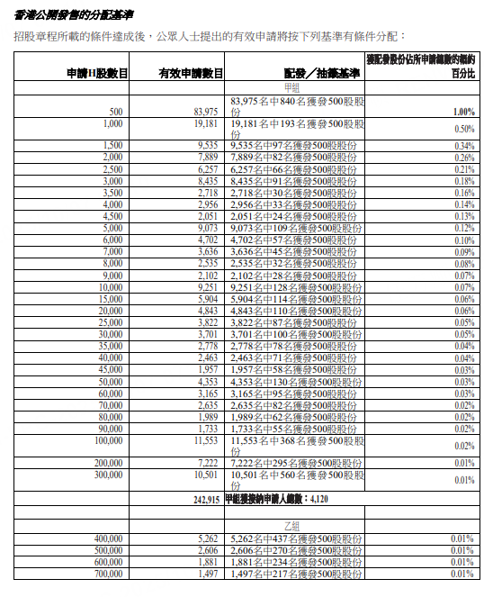 长风药业于香港公开发售获26.4万份认购,超购6696.8倍,一手中签率为1%,甲、乙组都未能稳中一手。而上限认购206万股的「顶头槌飞」有3514名,当中有1501名获发一手。长风药业国际发售获12.74倍认购。