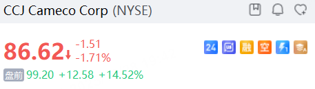 加拿大铀矿公司Cameco盘前涨超14%,参与美国政府与西屋电气800亿美元核反应堆建设协议