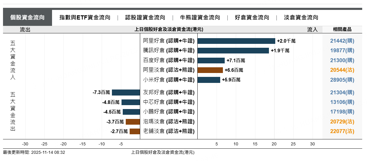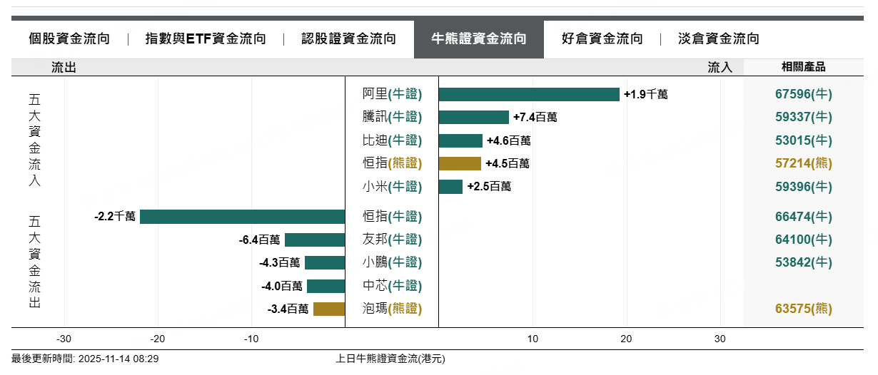阿里巴巴牛證上日淨流入1900萬元,騰訊牛證淨流入7400萬元,比亞迪牛證淨流入460萬元;