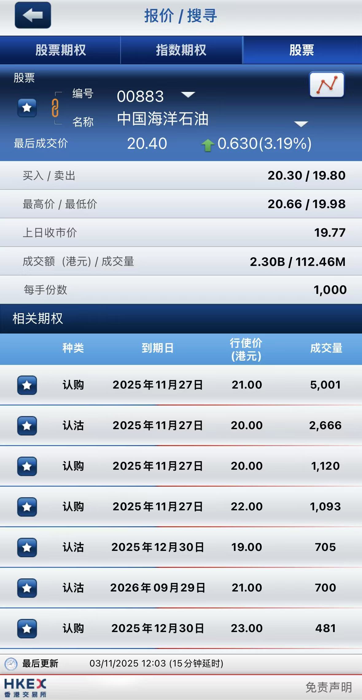 石油股表现活跃,三桶油同步拉升,其中,中国海洋石油涨超3%,股价创阶段新高;期权方面,中国海洋石油期权成交量近1.65万张,其中11月27日到期行使价21港元的认购期权成交居前,成交超5000张。