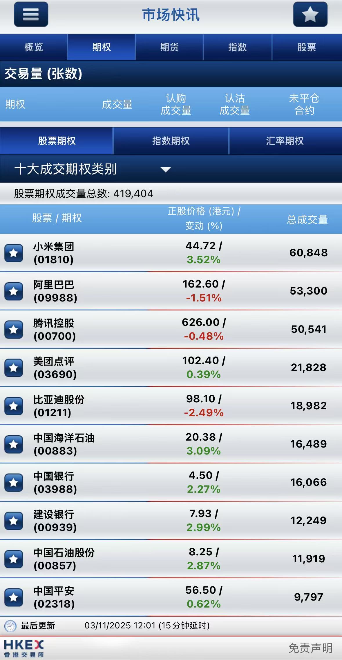 截止午间收盘,港股期权半日成交近42万张,其中,小米集团-W成交量居首,期权成交突破6万张;阿里巴巴-W名列次席,期权成交5.33万张;腾讯控股位居第三,期权成交5.05万张。