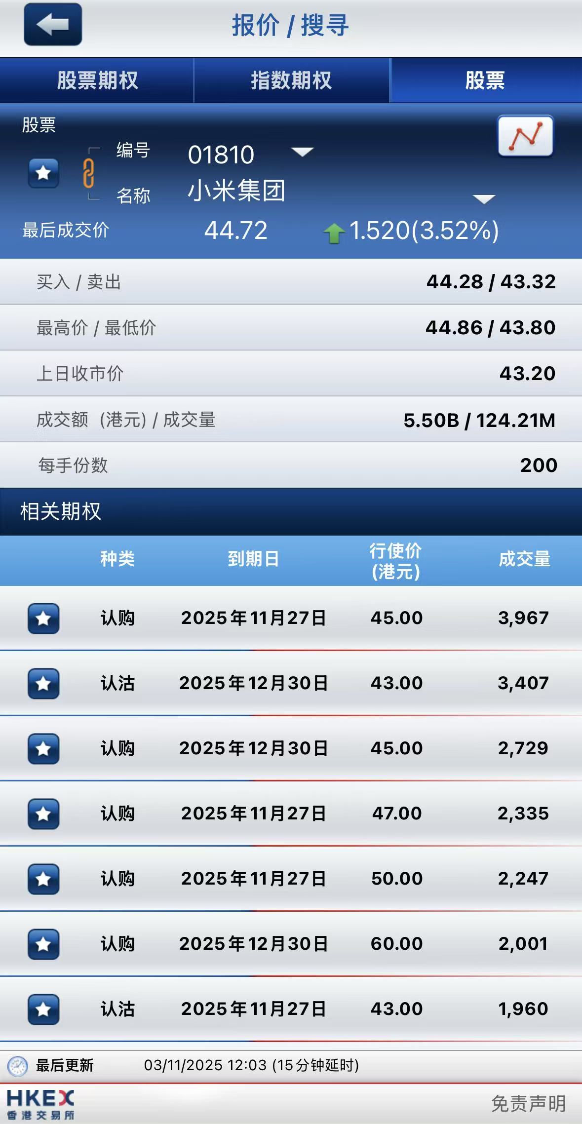 小米集团-W上涨3.5%,成交额超55亿港元;期权方面,小米集团期权成交量激增至逾6万张,其中11月27日到期行使价45港元的认购期权成交居前,成交近4000张。