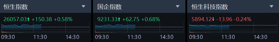 11月3日,港股上午盘三大指数涨跌不一,恒生指数涨0.58%重回26000点,国企指数涨0.68%,恒生科技指数表现较弱,午间收跌0.24%。