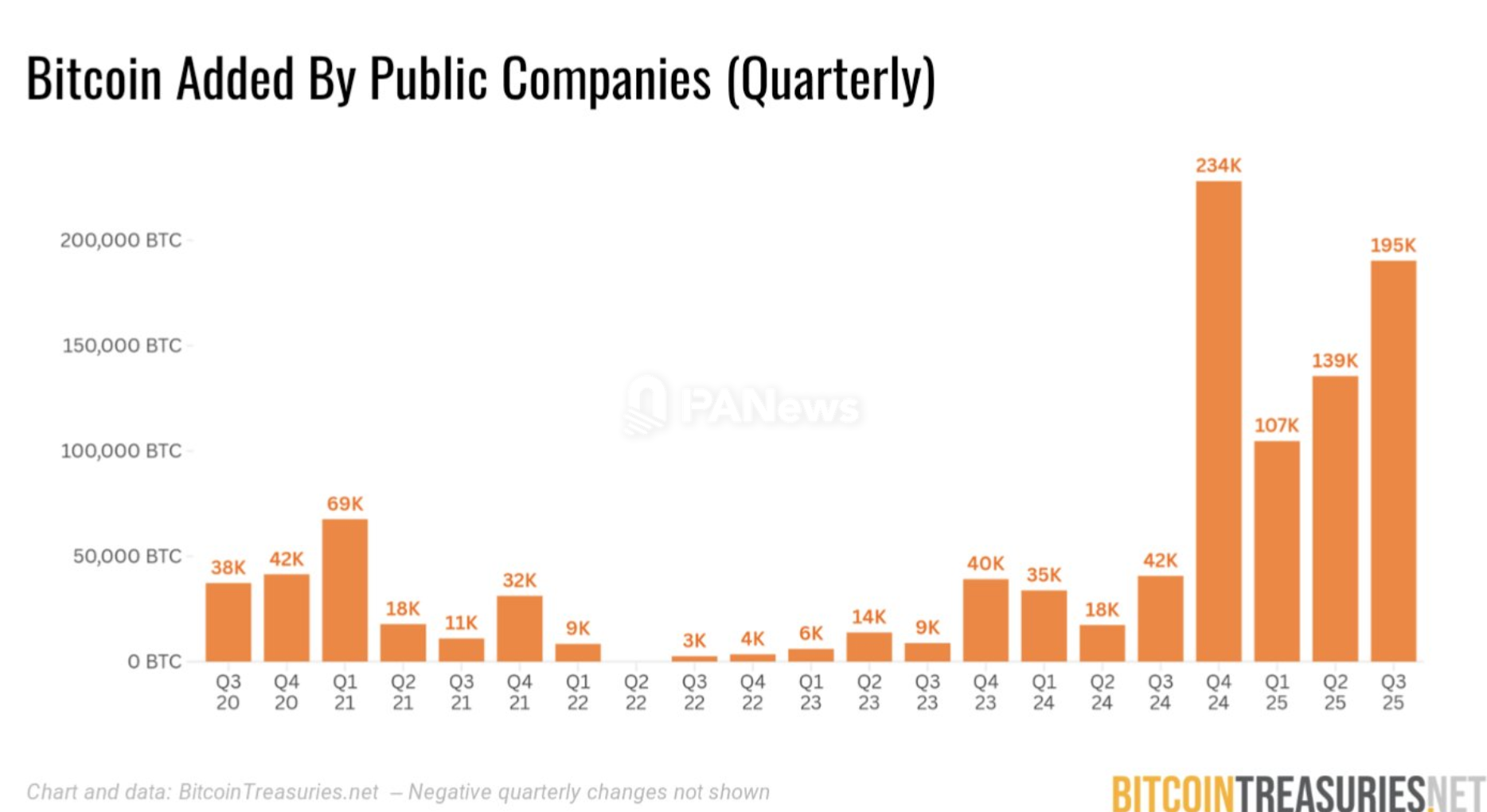 11月12日消息,据Bitcoin Treasuries数据显示,2025年第三季度,全球上市公司合计新增持有19.5万枚比特币,按当季均价计算约合205亿美元。这是继今年第二季度(增持13.9万枚BTC)后的又一季度大规模机构买入潮,显示企业层面对比特币作为储备资产的配置热度持续上升。数据显示,自2024年初以来,上市公司累计增持比特币超过70万枚。