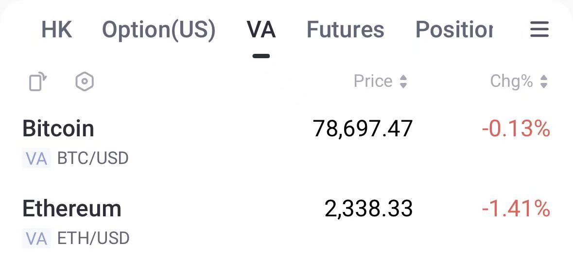 Tiger Trade行情显示,BTC回落至78697美元,24H降幅0.13%;ETH跌至2338美元,日内降幅1.41%。
