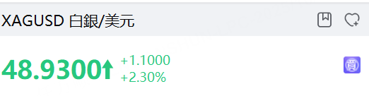 现货白银日内升幅扩大至逾2%,报48.93美元/盎司。港股概念股 中国白银集团 涨13%;美股 白银ETF(iShares)夜盘涨2%。