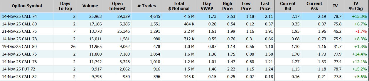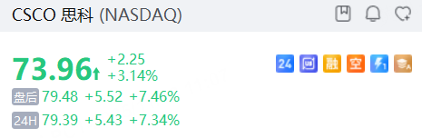 思科隔夜涨超3%,盘后续涨超7%。期权合约成交35.4万张,较90日均量放大6.2倍。11月14日到期的74美元的行权看涨期权交易量特别高,共有25,963份合约交易。 $CSCO 20251114 74.0 CALL$