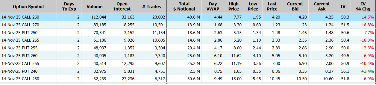 美国超微公司隔夜收涨9%,期权合约成交153.87万张。11月14日到期的260美元的行权看涨期权交易量特别高,共有112,044份合约交易。 $AMD 20251114 260.0 CALL$