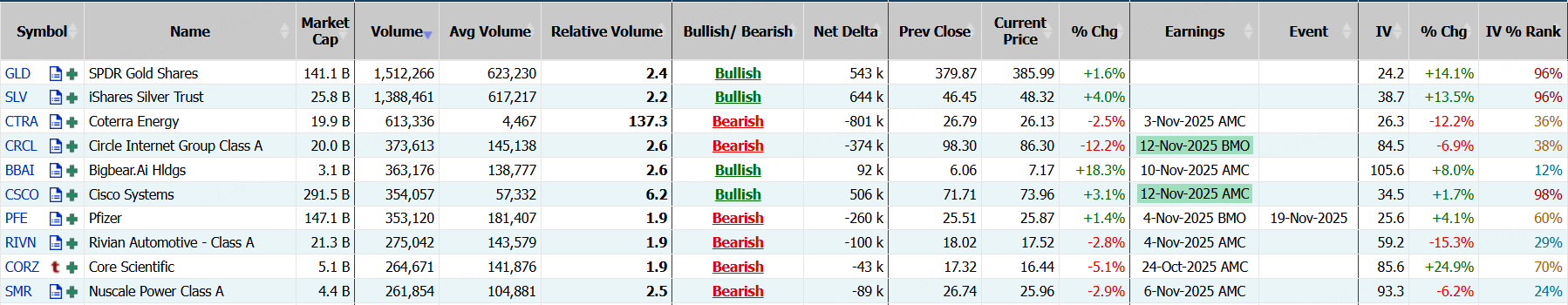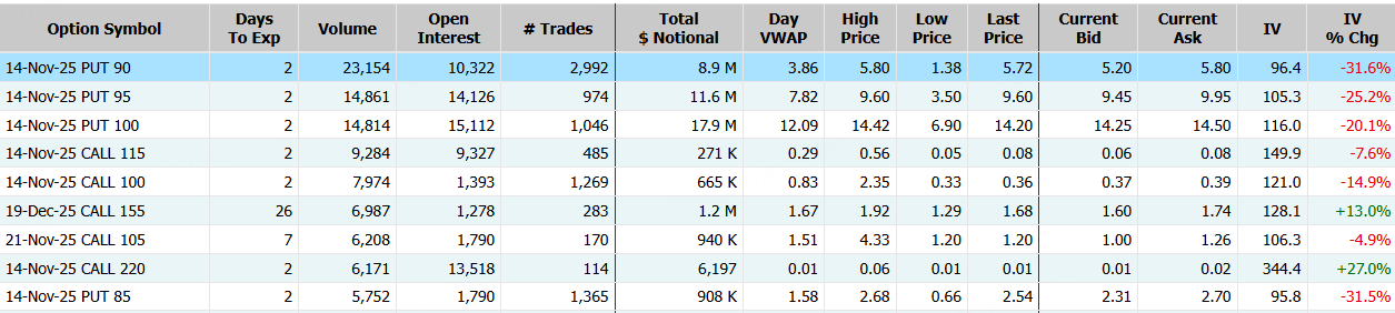 稳定币发行商Circle隔夜跌超12%,期权合约成交37.36万张,较90日均量放大2.6倍。11月14日到期的90美元的行权看跌期权交易量特别高,共有23,154份合约交易。 $CRCL 20251114 90.0 PUT$