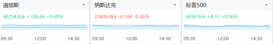 美东时间周三,美股三大指数涨跌不一。截至收盘,道指收涨0.68%续创收盘新高,纳指跌0.26%,标普500指数涨0.06%。