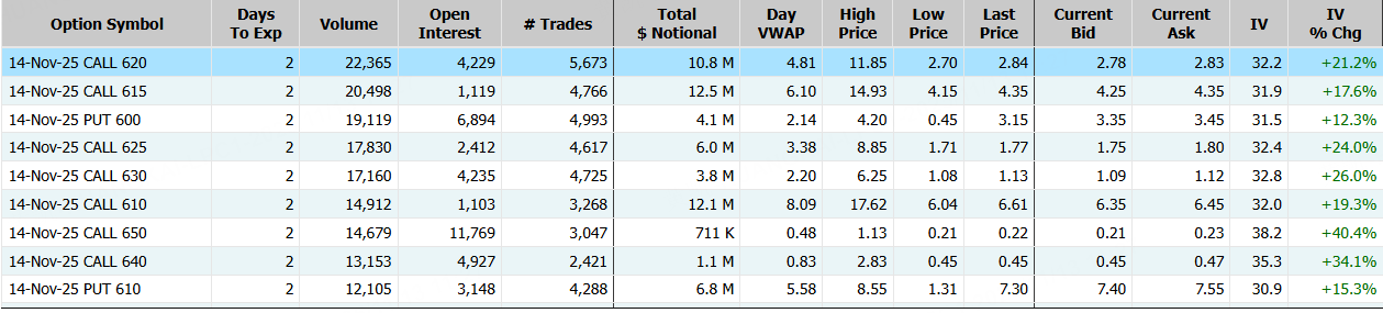 Meta Platforms隔夜跌近3%,期权合约成交73.44万张。11月14日到期的620美元的行权看涨期权交易量特别高,共有22,365份合约交易。 $META 20251114 620.0 CALL$