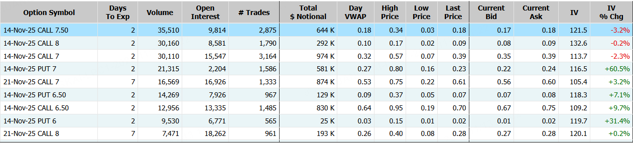 BigBear.ai隔夜涨超18%,期权合约成交36.32万张,较90日均量放大2.6倍。11月14日到期的7.5美元的行权看涨期权交易量特别高,共有35,510份合约交易。 $BBAI 20251114 7.5 CALL$