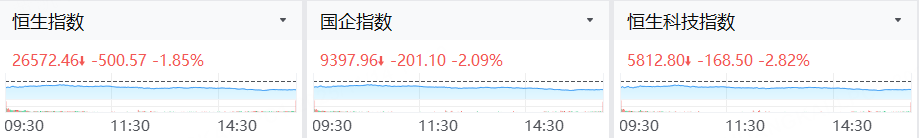 港股三大指数齐跌,恒生指数跌1.85%,恒生科技指数跌2.82%,国企指数跌2.09%。