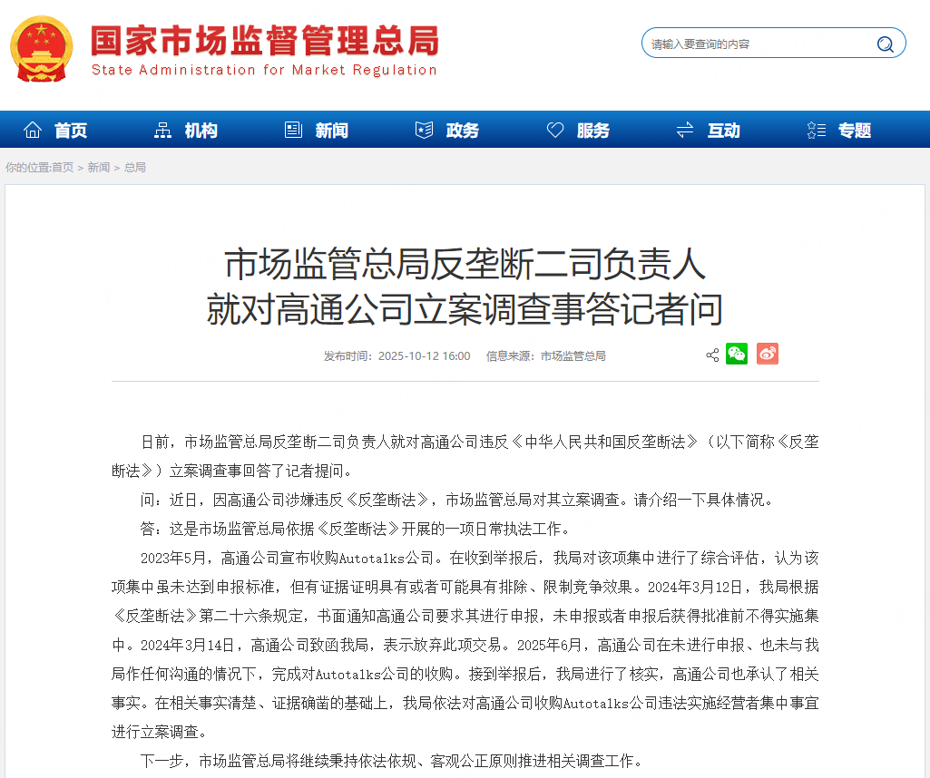 2023年5月,高通公司宣布收购Autotalks公司。在收到举报后,我局对该项集中进行了综合评估,认为该项集中虽未达到申报标准,但有证据证明具有或者可能具有排除、限制竞争效果。2024年3月12日,我局根据《反垄断法》第二十六条规定,书面通知高通公司要求其进行申报,未申报或者申报后获得批准前不得实施集中。2024年3月14日,高通公司致函我局,表示放弃此项交易。2025年6月,高通公司在未进行申报、也未与我局作任何沟通的情况下,完成对Autotalks公司的收购。接到举报后,我局进行了核实,高通公司也承认了相关事实。在相关事实清楚、证据确凿的基础上,我局依法对高通公司收购Autotalks公司违法实施经营者集中事宜进行立案调查。