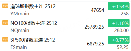 10月27日,美股三大股指期货上涨,截止发稿,道指期货涨0.54%,纳指期货涨1.10%,标普500指数期货涨0.77%。