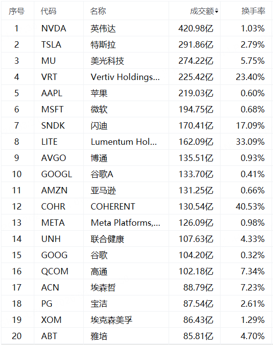 周五美股成交额第1名英伟达收跌3.28%,成交420.98亿美元。