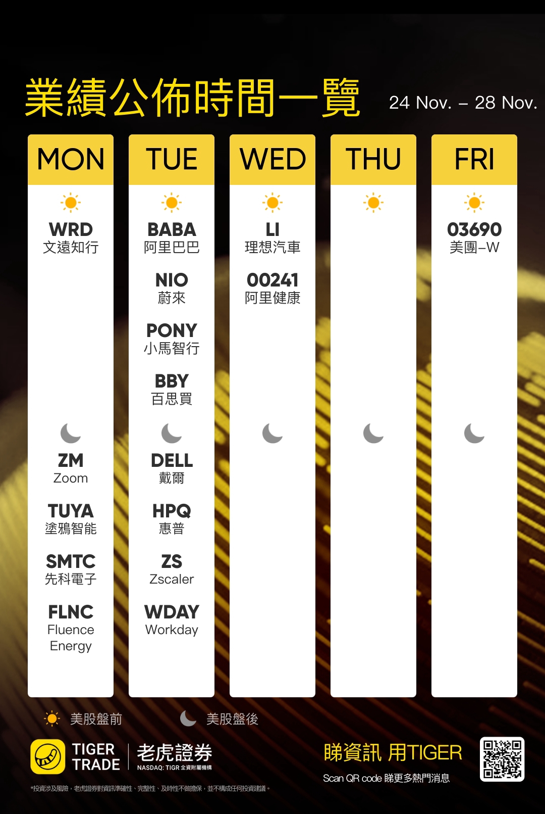 阿里、美团、理想、蔚来、Zoom、惠普、戴尔将发布财报