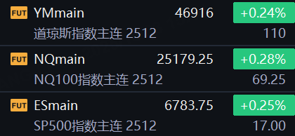 10月3日,美股三大股指期货齐涨,截止发稿,道指期货涨0.24%,纳指期货涨0.28%,标普500指数期货涨0.25%。