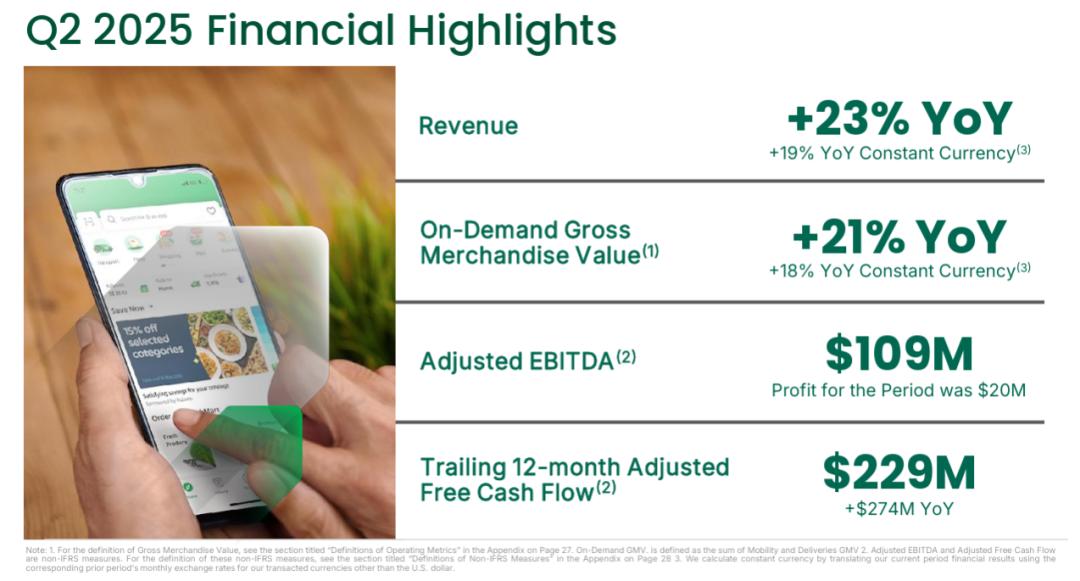 2025年二季度,Grab平台月活跃交易用户数(MTUs)达到4,620万,营收同比增长23%,达8.19亿美元。按需服务(即出行和外卖)GMV同比增长21%,达53.5亿美元。调整后EBITDA连续第14个季度增长,达到1.09亿美元。公司还实现了2,000万美元的净利润,是上一季度的两倍。
