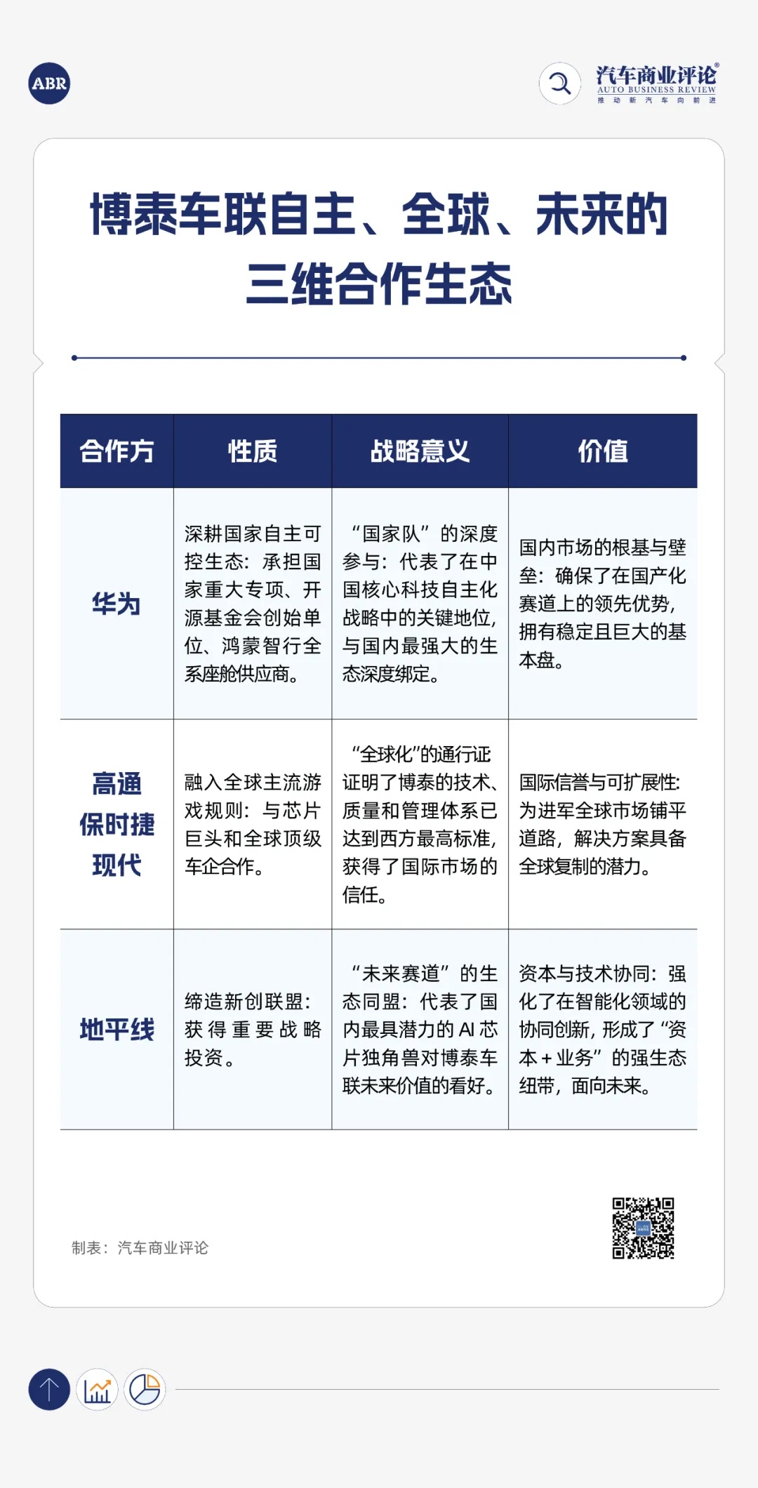 博泰车联更大的优势在于它是唯一一家能同时实现“中国核心生态深度绑定”“西方顶级标准认可”和“未来AI芯片龙头资本加持”的公司。《汽车商业评论》注意到,它已经成功构建了业内罕见的、覆盖所有核心战略维度的顶级合作生态。