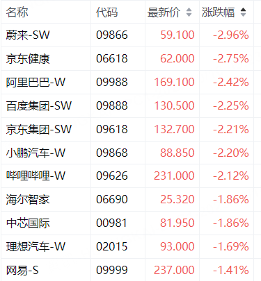 科指成分股中,蔚来-SW跌2.96%,京东健康跌2.75%,阿里巴巴-W跌2.42%,百度集团-SW跌2.25%,京东集团-SW跌2.21%。