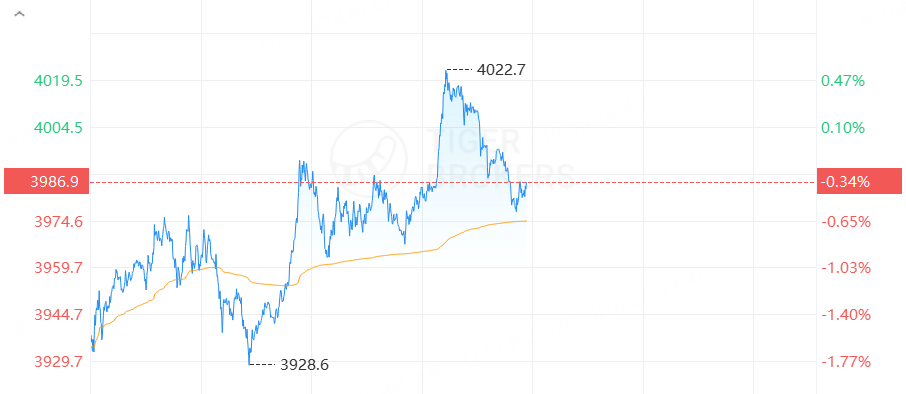 黄金期货下跌,截止发稿,跌0.34%,报3,986.9美元/盎司。
