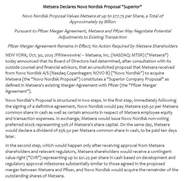 该提案的结构分为两步,首先诺和诺德将支付Metsera每股56.50美元现金,并发行50%股本的非投票优先股。随后,Metsera股东将通过附加价值权(CVR)收到最多21.25美元的现金,基于类似辉瑞提案的开发和审批条件。此提案的总价值为90亿美元,较辉瑞交易溢价133%。