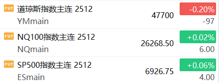 10月30日,美股三大股指期货涨跌不一,截止发稿,道指期货跌0.20%,纳指期货涨0.02%,标普500指数期货涨0.06%。