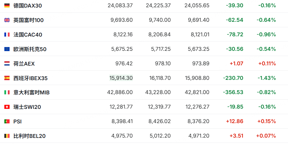 欧洲主要股指跌多涨少,德国DAX30跌0.16%,法国CAC40跌0.96%。