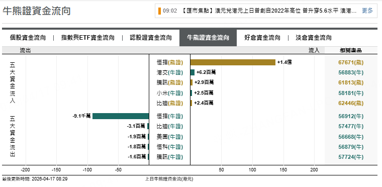 恒指熊證上日流入1.4億元,港交牛證流入620萬元,騰訊熊證流入290萬元。