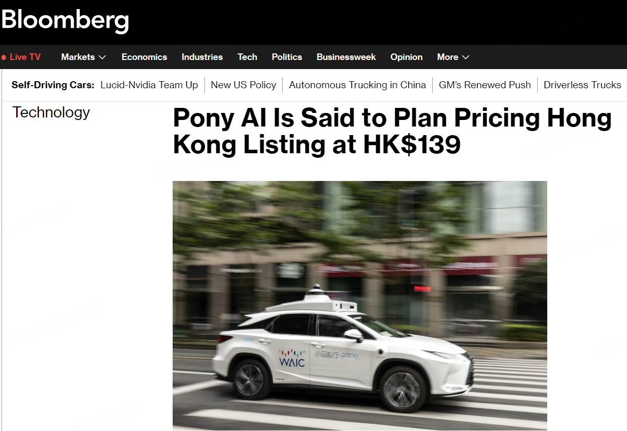 11月3日,据知情人士透露,中国自动驾驶公司小马智行正告知潜在投资者,计划将其在香港的上市价格定为每股139港元。由于该信息尚未公开,知情人士要求匿名。